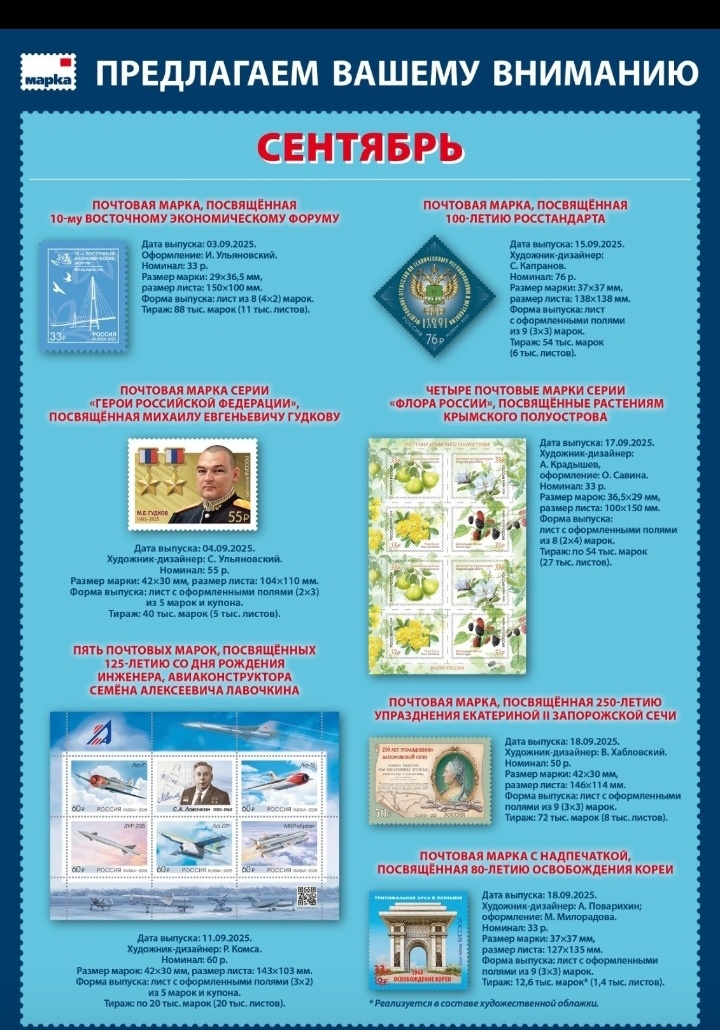 Акционерное Общество Марка опубликовало "План выпуск почтовых марок" на сентябрь 2025 год.