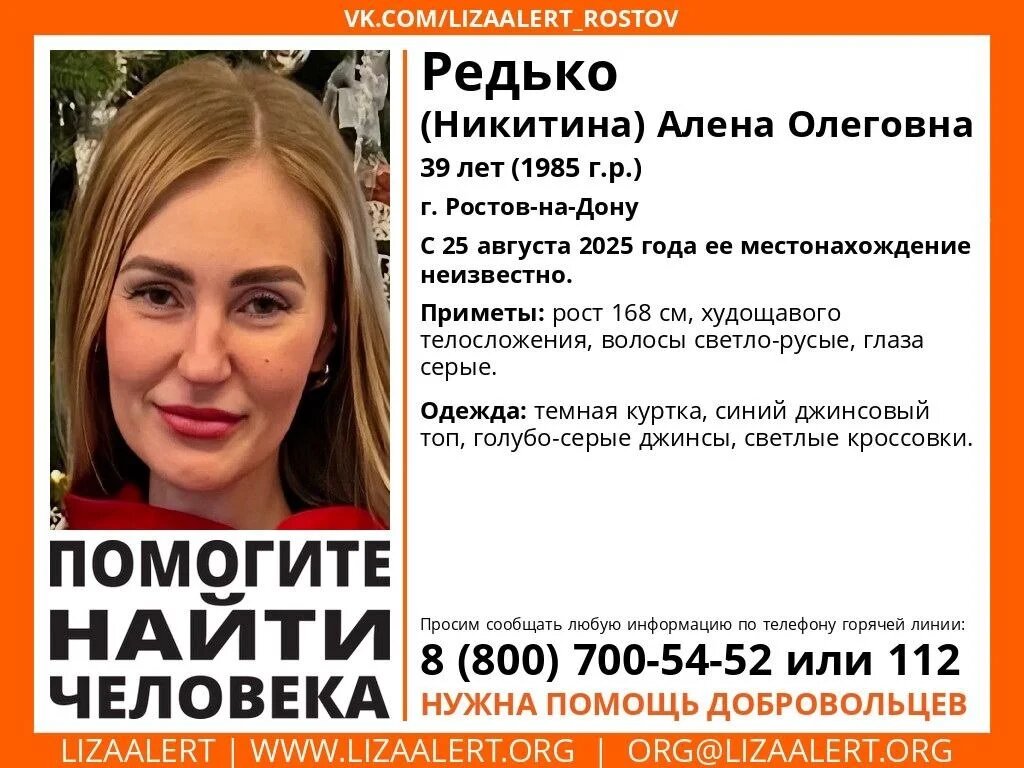 В Ростове-на-Дону полиция начала поиски Алёны Редько, 39 лет, которая пропала вечером 25 августа. Женщина уехала из дома по адресу г. Аксай, ул. Луначарского, 235, вместе с бывшим мужем, однако до настоящего времени её местонахождение остаётся неизвестным. По информации правоохранительных органов, около 19:30 Алёна покинула дом на автомобиле в компании бывшего мужа. Мужчина сообщил, что последний раз видел её примерно в 21:30, когда высадил на пересечении улиц Ульяновской и Семашко. После этого женщина перестала выходить на связь и не появлялась дома. Приметы разыскиваемой: причёска, как на фото; укороченные джинсы; чёрная кожаная куртка; бело-салатовые кроссовки со стразами. В настоящий момент сотрудники полиции проводят проверку, опрашивают свидетелей и изучают все возможные версии исчезновения. Всех, кто обладает любой информацией о местонахождении Алёны Редько, просят сообщить по телефону маме Елены Витальевны: 8 928 270-26-33 или в Отдел полиции №4 г. Ростова-на-Дону: 8 (863) 249-