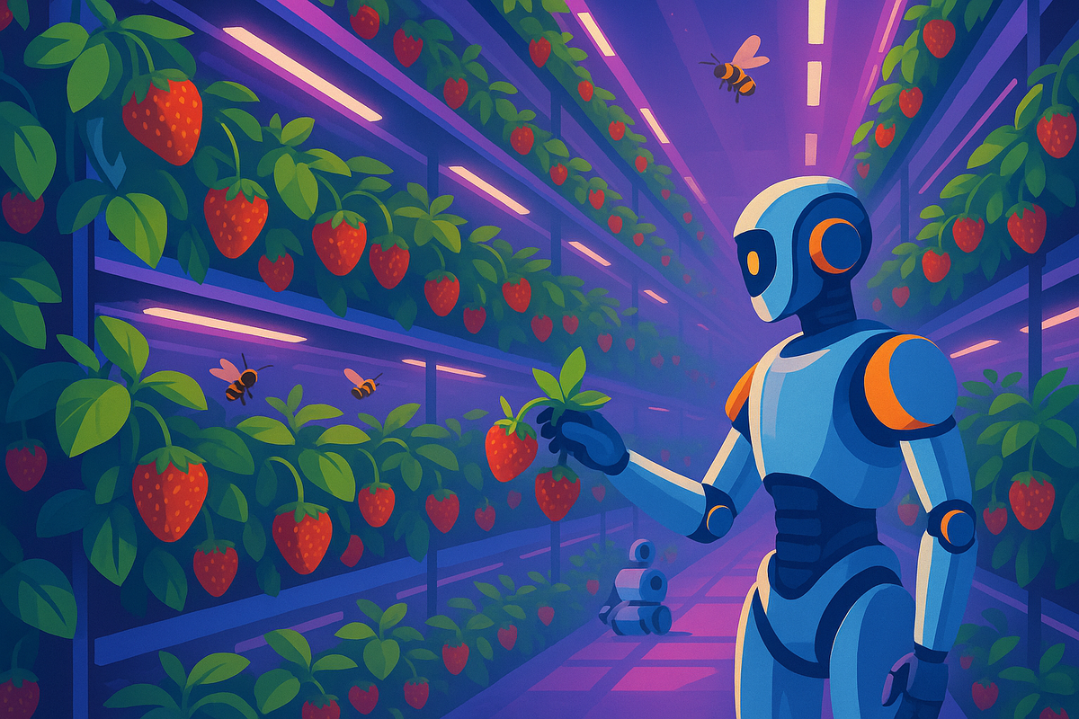 Городские фермы, где зелень растёт на многоярусных стеллажах под светодиодами, уже перестали быть научной фантастикой. Вертикальное земледелие экономит землю и воду, но до недавнего времени оставалось нишевым: стоимость урожая была высокой, а трудоёмкость — огромной. Американская компания Oishii продемонстрировала, что сочетание искусственного интеллекта, робототехники и даже… пчёл может превратить вертикальную ферму в эффективное производство. На бывшем заводе Budweiser в Нью‑Джерси она построила Amatelas Farm — полностью автоматизированную ферму по выращиванию японской клубники сорта Omakase.