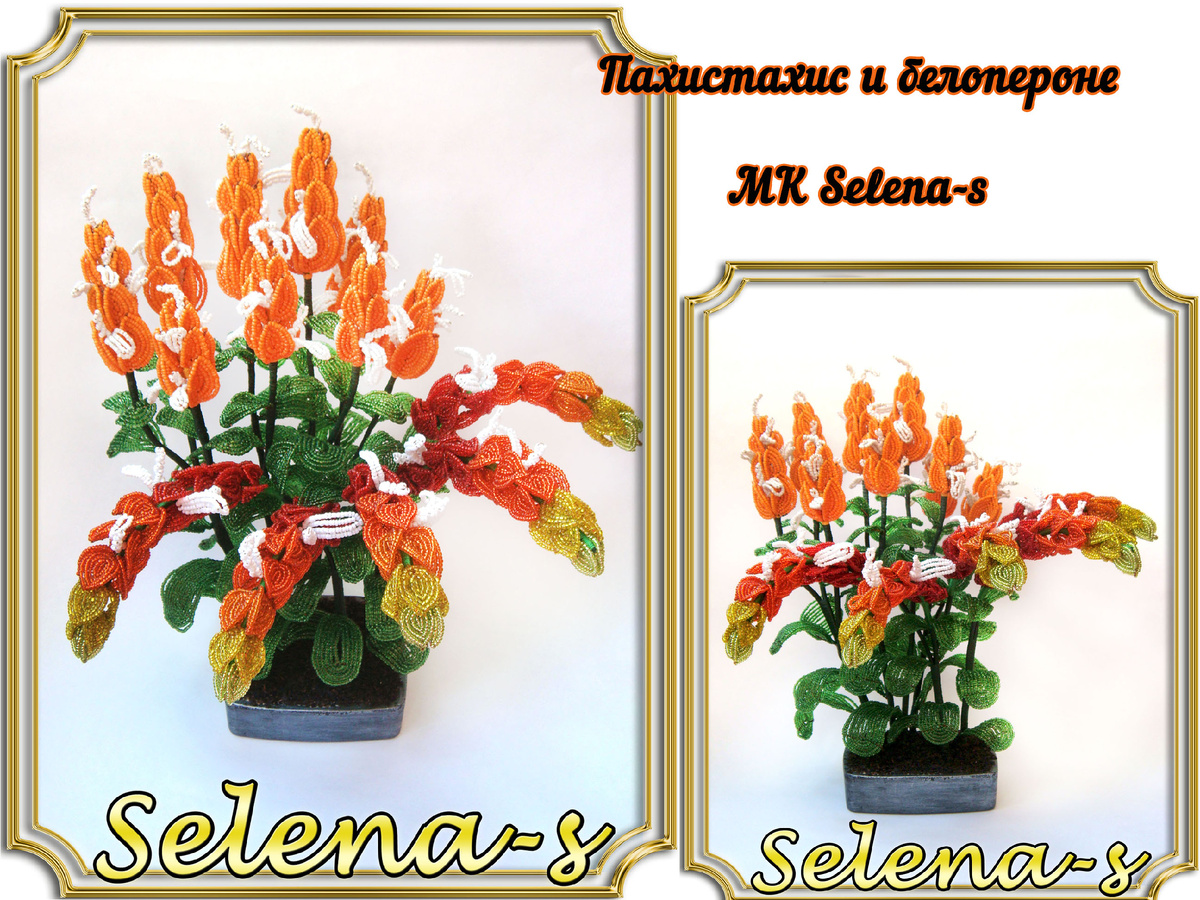 Продолжение. Начало - пахистахис, вот тут. Смотрим расцветку белопероне (фоточки справа) и подбираем бисер. Лепестки. Собираем кисти. Листики. Собираем соцветия. И сажаем! 😜 Конечно, можно и по отдельности сажать каждую растишку в свой горшочек, но у меня задумывалась именно такая композиция - пахистахис и белопероне вместе. До новых встреч! 😘