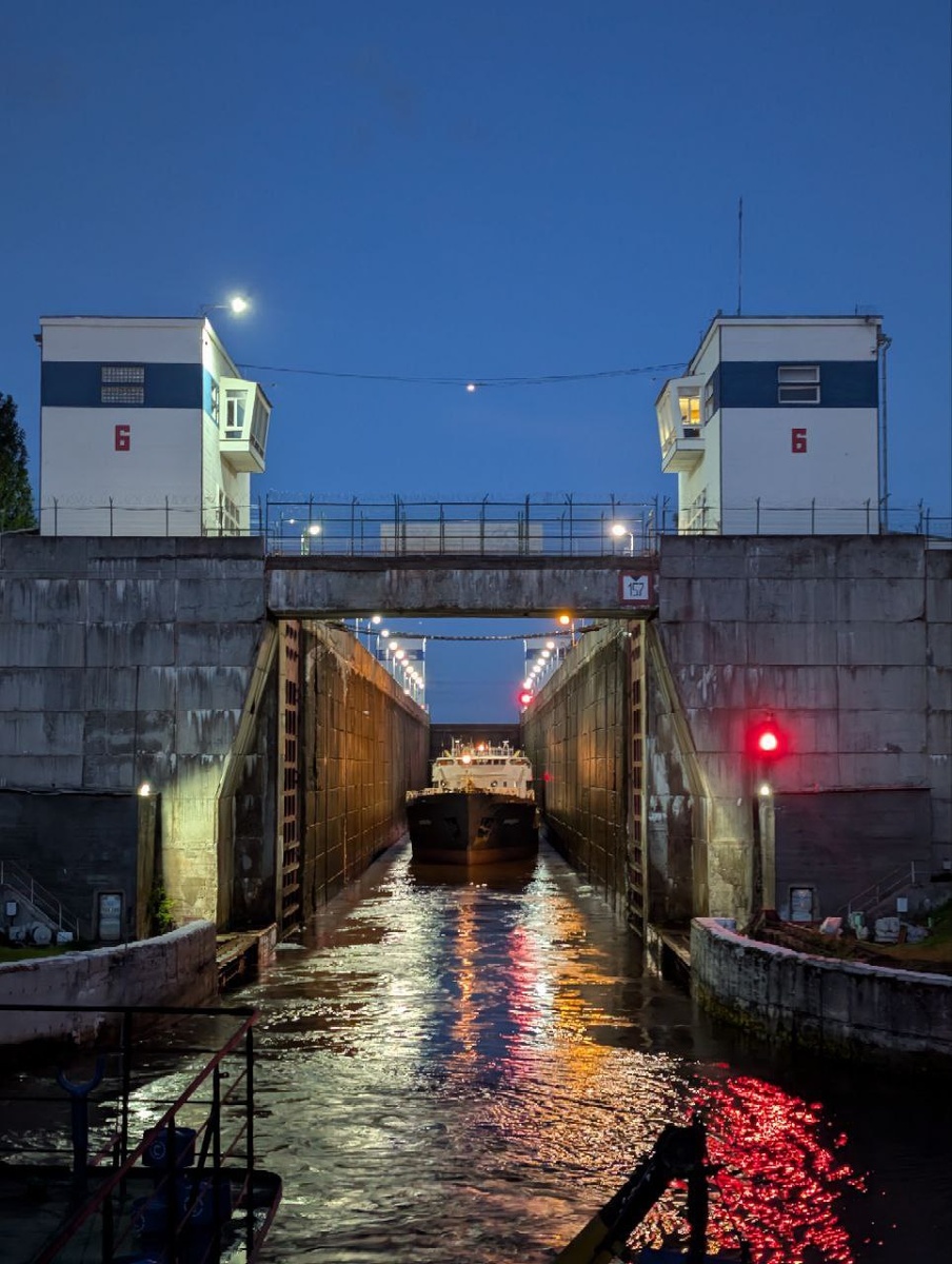 Грузовой теплоход выходит из камеры VI шлюза Волго-Балтийского канала