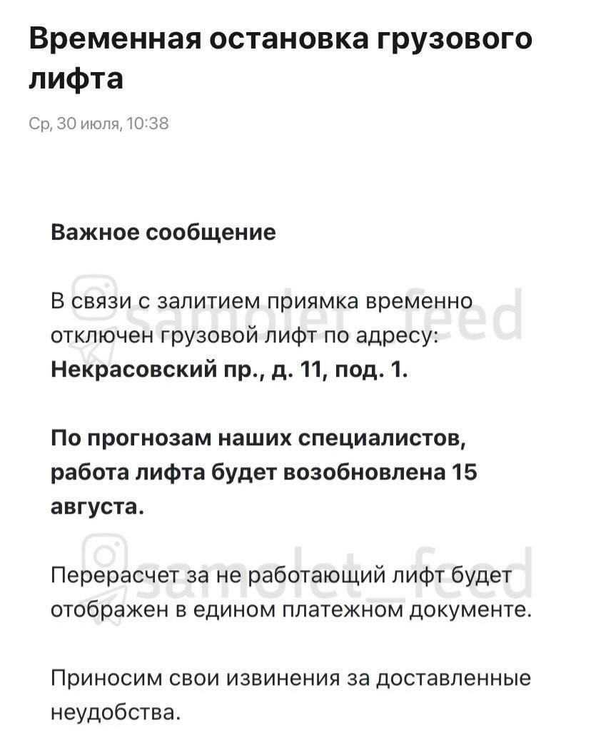 #нампишут СРОЧНО: Лифты не работают более месяца в доме по Некрасовскому проезду, 11, подъезд 1! Ситуация с лифтами в нашем доме стала абсолютно недопустимой и требует немедленного вмешательства! Текущая ситуация: Пассажирский лифт ломается каждый день. После заявки в УК его чинят, но через 2 часа он снова выходит из строя. Это бесконечный цикл бездействия! Грузовой лифт не работает уже больше месяца. Официально обещали починить к 15 августа, но воз и ныне там. УК игнорирует нас: обратной связи нет, а режим работы (пн-пт, 9:00-18:00) сделан так, что работающие жители не могут попасть на прием. Телефонные операторы лишь создают пустые заявки. Особенно тяжело приходится пожилым людям, для которых подъем на верхние этажи становится невыполнимой и опасной для здоровья задачей. Родителям с маленькими детьми и колясками, которые буквально оказываются в заточении в своих квартирах или вынуждены носить детей на руках по лестнице. Это грубейшее нарушение наших прав на комфортное и безопасн