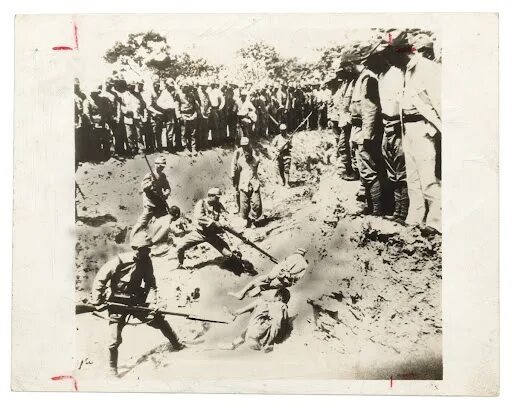 - Массовые казни. Солдат китайской армии, сдавшихся в плен, а также мужчин гражданского населения, подозреваемых в том, что они были солдатами, массово расстреливали, закалывали штыками, обезглавливали. Их свозили на берег реки Янцзы и убивали, так что вода покраснела от крови.