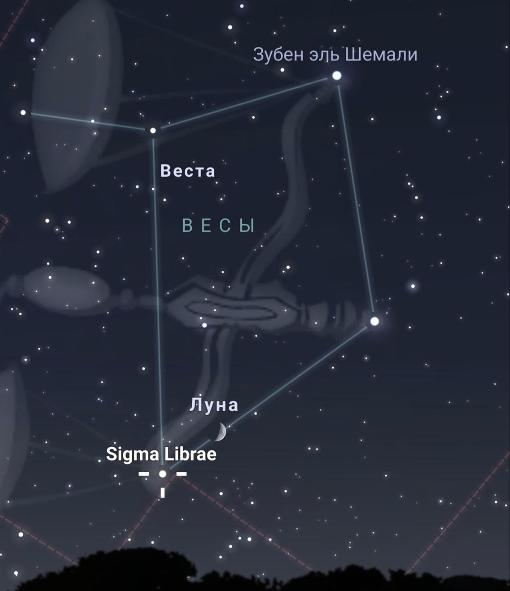 Луна сегодня находится в созвездии Весы. Сегодня серпик Луны находится в Весах, рядом со звездой сигма. Собственных имен у заезды насколько. Брахиум (лат. рука, лапа), Зубен-Хакраби (клешня Скорпиона). Почему такие названия у звезды из созвездия Весов? Читаем! С этой звездой произошла интересная история. Ее, буквально, "украли" у созвездия Скорпиона. Брахиум долгое время была частью созвездия Скорпиона, но из-за своего удалённого положения от ярких светил этого созвездия и близкого соседства со звёздами Весов, в XIX веке Бенджамин Гулд перенёс её в созвездие Весы, обозначив как σ. Исходя из старых карт, Луна сейчас находится точно в правой клешне Скорпиона. Сигма Весов - звезда М класса, красный гигант. Звезда расположена в 290 световых годах от нас, излучает свет в 1900 раз ярче Солнца. Её красноватая поверхность имеет температуру 3600 K, а радиус в 110 раз превышает солнечный! Если бы она находилась на месте нашего Солнца, её поверхность простиралась бы до середины пути между Мерку