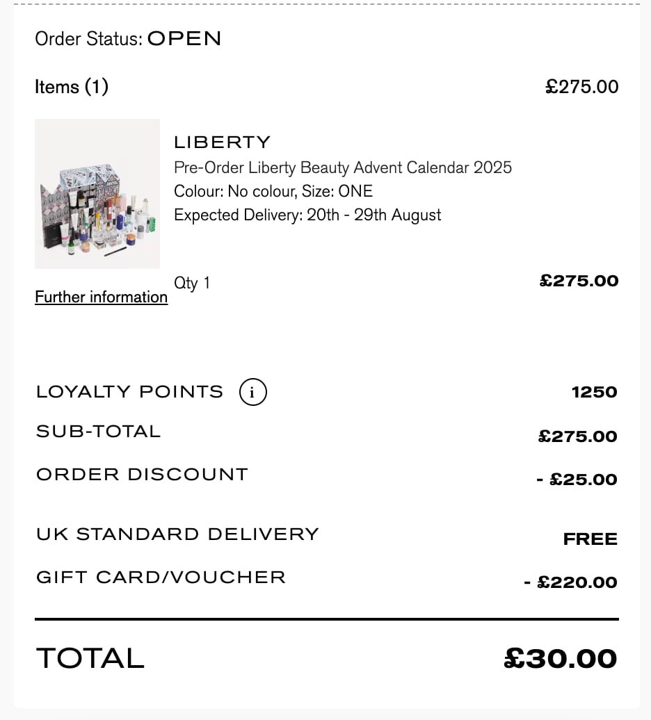 Всем приветики!👋 Вчера вы собрали даже больше 150 лайков на пост, так что как и обещала рассказываю как же мне удалось купить Адвент Liberty всего за 30 фунтов при его стоимости 275ф😁 Да, это действительно правда, с меня действительно списали за заказ ровно 30ф. А по сути, я даже могла купить этот адвент за 10ф. Но я до последнего не рассказывала вам, так как была не уверена, что всё получится и они действительно одобрят заказ и отправят Адвент. Но так как Адвент уже на складе, рассказываю! На самом деле это работа ВДОЛГУЮ. Помните, в прошлом году, я рассказывала вам, что подписалась на коробочки от Liberty? Это называется The Beauty Drop Подписавшись на The Beauty Drop, подписчики каждый январь, апрель, июль и октябрь получают бьюти-бокс стоимостью более 300 фунтов стерлингов. После регистрации подписчикам выдаётся номер ваучера Beauty Drop, который пополняется при каждом платеже. При трате средств Beauty Drop начисляются баллы лояльности, которые затем конвертируются в вауч