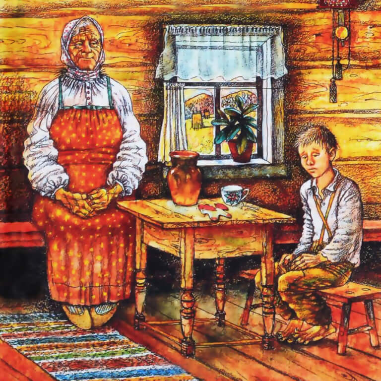Но вот выговорилась бабушка. Ушёл куда-то дед. Я сидел, разглаживал заплатку на штанах, вытягивал из неё нитки. А когда поднял голову, увидел перед собой…