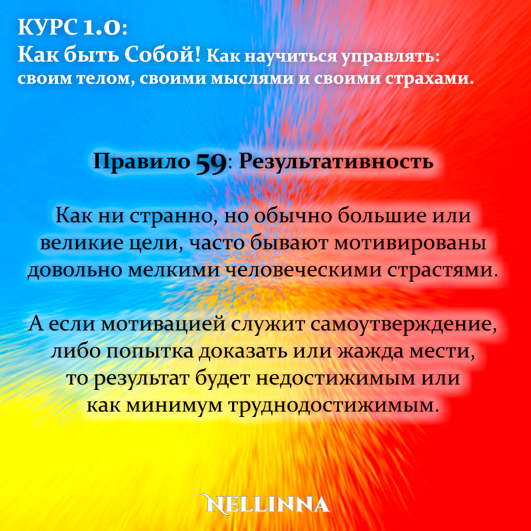 Правило 59: Результативность Как ни странно, но обычно большие или великие цели, часто бывают мотивированы довольно мелкими человеческими страстями. А если мотивацией служит самоутверждение, либо попытка доказать или жажда мести, то результат будет недостижимым или как минимум труднодостижимым. Другими словами, если человек бежит к своей цели с нехорошей мотивацией, то обычно бывает крайне разочарован достигнутыми результатами. Поднявшись наверх человек обнаруживает, что его проблемы не только не решились, но и усугубились. Чтобы не пропустить следующую публикацию – Подписывайтесь! И делитесь полезной и бесплатной информацией! #курс #тренинг #обучение #практикум