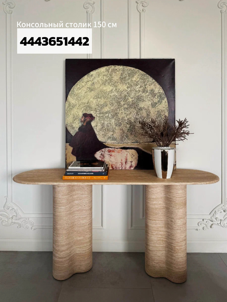 Травертин — материал с характером, но именно он создаёт то самое ощущение «дорогого спокойствия» дома. Хотите эффект вау без ремонта? Достаточно одной крупной консоли (арт. 4443651442) и пары аксессуаров — поднос (арт. 103084767709) и лампа (арт. 4333765292) свяжут пространство в единую историю. Остальные позиции — для тех, кто готов играть масштабнее: журнальные столы, подвесы и настенные плафоны формируют цельный, взрослый интерьер.