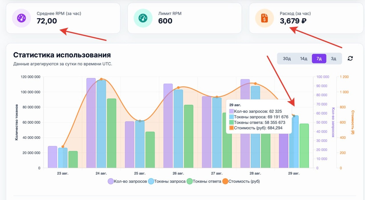 Наша статистика использования ИИ по дням. И я считаю, что мы только в начале пути, т.к. именно тот, кто сможет органично впихнуть ИИ в бизнес - получит некое конкурентное приемущество (сорри, кэп Очевидность). Временное, признаюсь. Сегодня пополнили баланс на 50к - хватит на 2 месяца при наших темпах. Задействуем openAI gpt-mini, но присматриваемся к Kimi k2... Пока думающие модели медленные и дорогие. Попробуем на openRoute 1000 в сутки бесплатно для Kimi k2. p.s. RPM - запросы в минуту, у нас чуть больше 1 запроса в секунду каждый день, без остановки. Русский ИТ бизнес