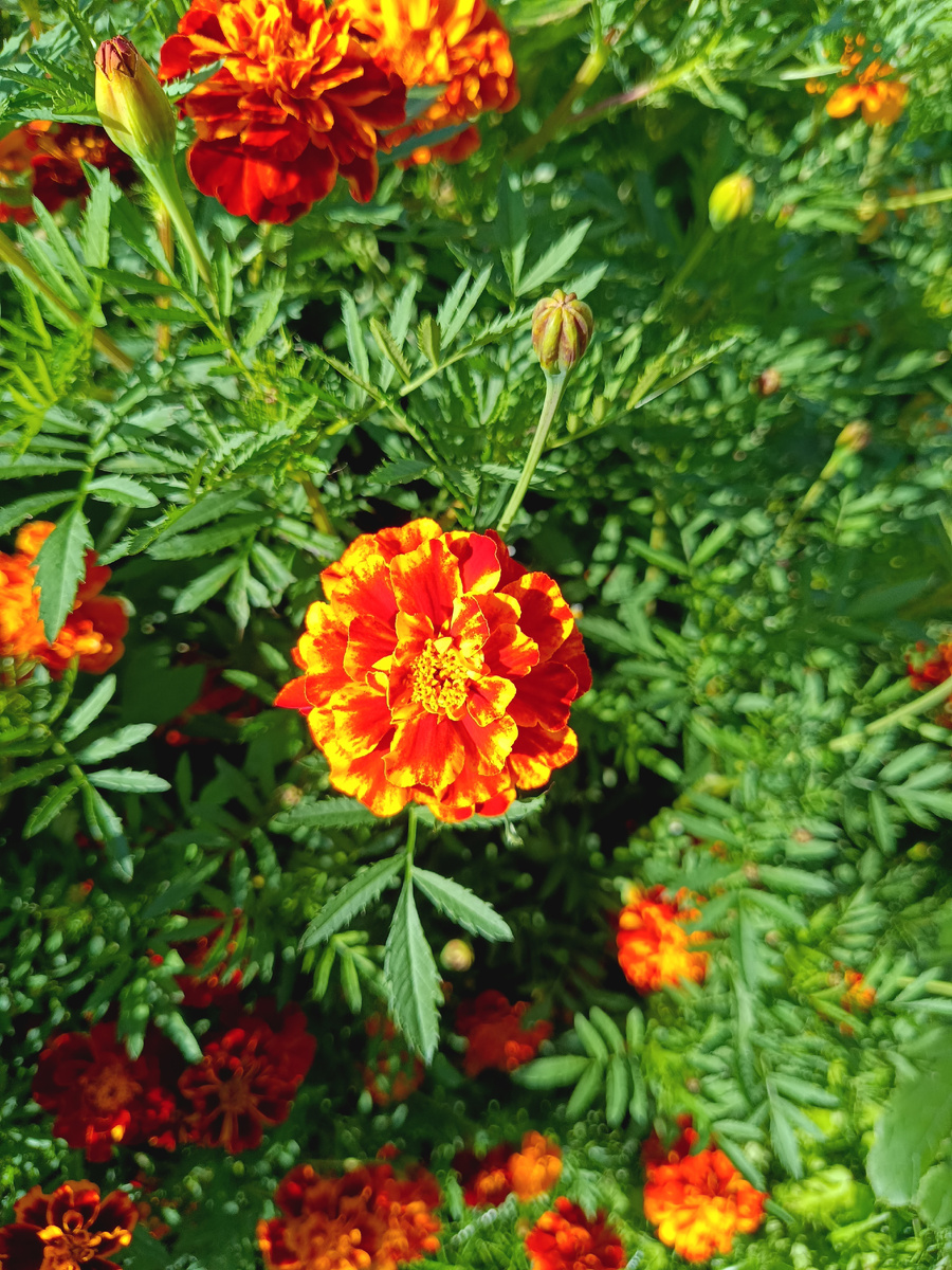 Всем привет 👋🏻 У нас во всю начали цвести бархатцы. Каждый год бархатцы на клумбах у нашего дома сажаются в обязательном порядке. Мама выращивает бархатцы из своих семян, которые собирает каждый год. Посев семян мама начинает еще весной, поэтому на подоконниках у нас везде стоят емкости с рассадой бархатцев. Потом уже, когда погода позволяет, они саженцы отправляются на клумбы. Иногда, если весна теплая, мама выращивает бархатцы не на подоконниках, а в теплице. У нас бархатцы поздноцветущие, поэтому цветение начинается только со второй половины августа. Наверное поэтому для меня эти цветы ассоциируются с осенью. Просто у нас на клумбах осенью только бархатцы остаются. И я всегда, когда вижу цветы бархатцев, понимаю, что всё... Лето кончилось. Основной задачей бархатцев является заполнение клумб, когда уже все другие растения отцвели и собрались на покой. Ну и мама еще их сажает перед высокими растениями в качестве нижнего яруса. Раньше я не была сторонником этого, так как барх