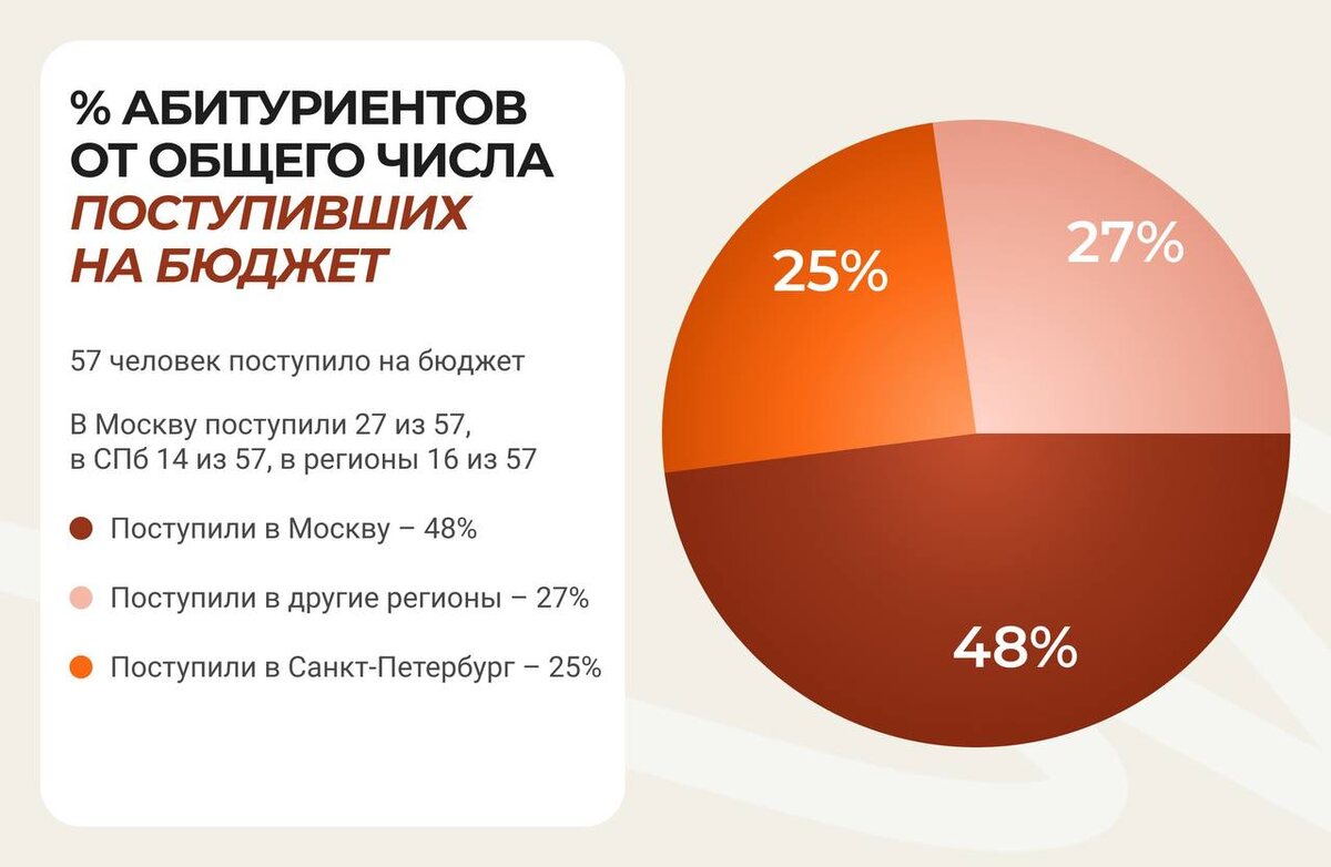 К нам обращались и за другими услугами: В столицу на бюджет мы помогли поступить 48% наших клиентов. 25% стали студентами-бюджетниками питерских вузов, а 27% — попали в приказы о зачислении региональных вузов.