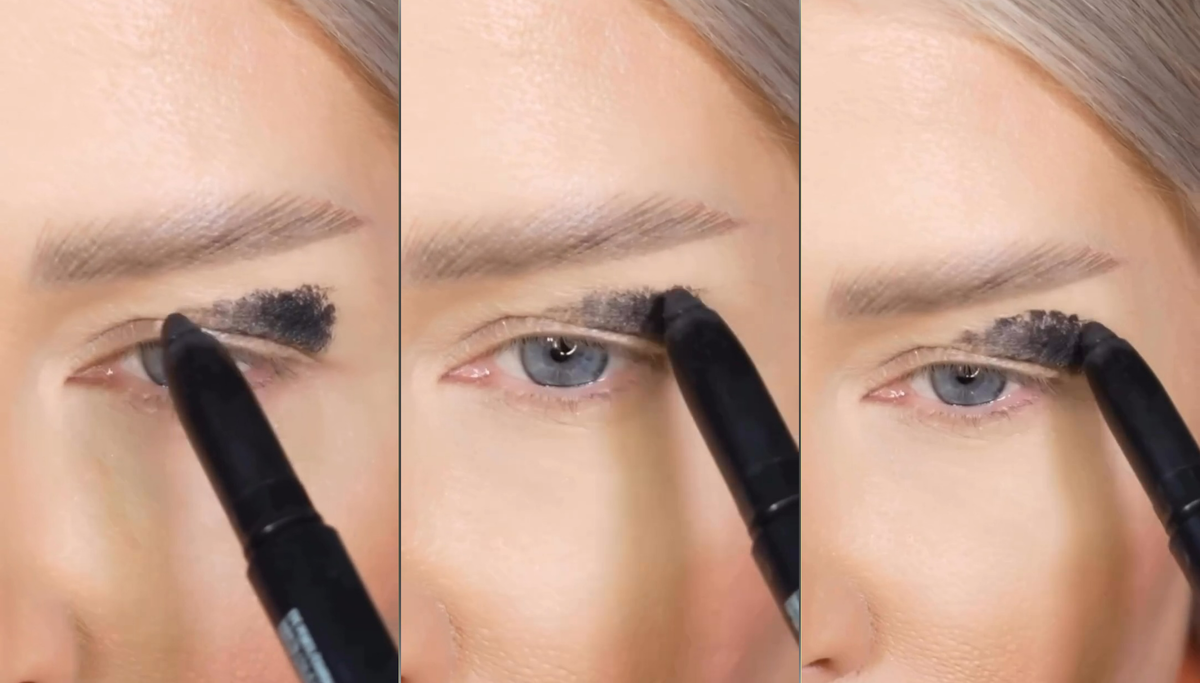 Глубокий акцент. Теперь беру ещё более тёмный оттенок — иногда даже чёрный. Но наношу его локально — в уголок глаза. Здесь срабатывает иллюзия: мы создаём тень, которая визуально приподнимает кожу.