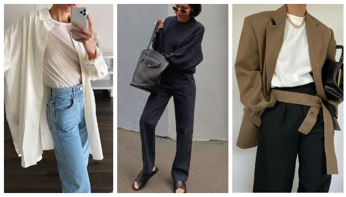 Минимализм и элегантность — два тесно связанных понятия. Минималистичный стиль подразумевает сдержанность в использовании ярких цветов и декоративных элементов. Особенно часто принципы минимализма прослеживаются в одежде, которую надевают в переходные периоды года, когда актуальна верхняя одежда. Светло-серый тренч — великолепный элемент гардероба, который гармонично сочетается с белой футболкой и светлыми джинсами. Чтобы завершить образ, добавьте к нему чёрную сумочку, украшенную крупной золотистой цепочкой. Чёрный тренч сливается с чёрной футболкой и чёрными лоферами. Единственное светлое пятно в образе – брюки из светло-голубого денима. Крупная бижутерия часто украшает минималистичный образ. Такая роскошная деталь хорошо смотрится на фоне белой футболки, светло-коричневого пиджака и чёрных брюк. Сумка саквояж с золотистой фурнитурой дополняет общий вид. Минимализм говорит об удобстве. Джинсы и светло-синий пиджак можно освежить белой футболкой и белыми лодочками на среднем каблуке.