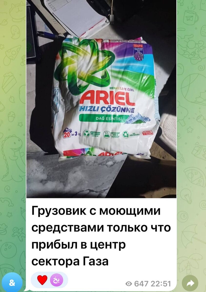 Кстати, в Газу поставляют не только еду, но и моющие средства.