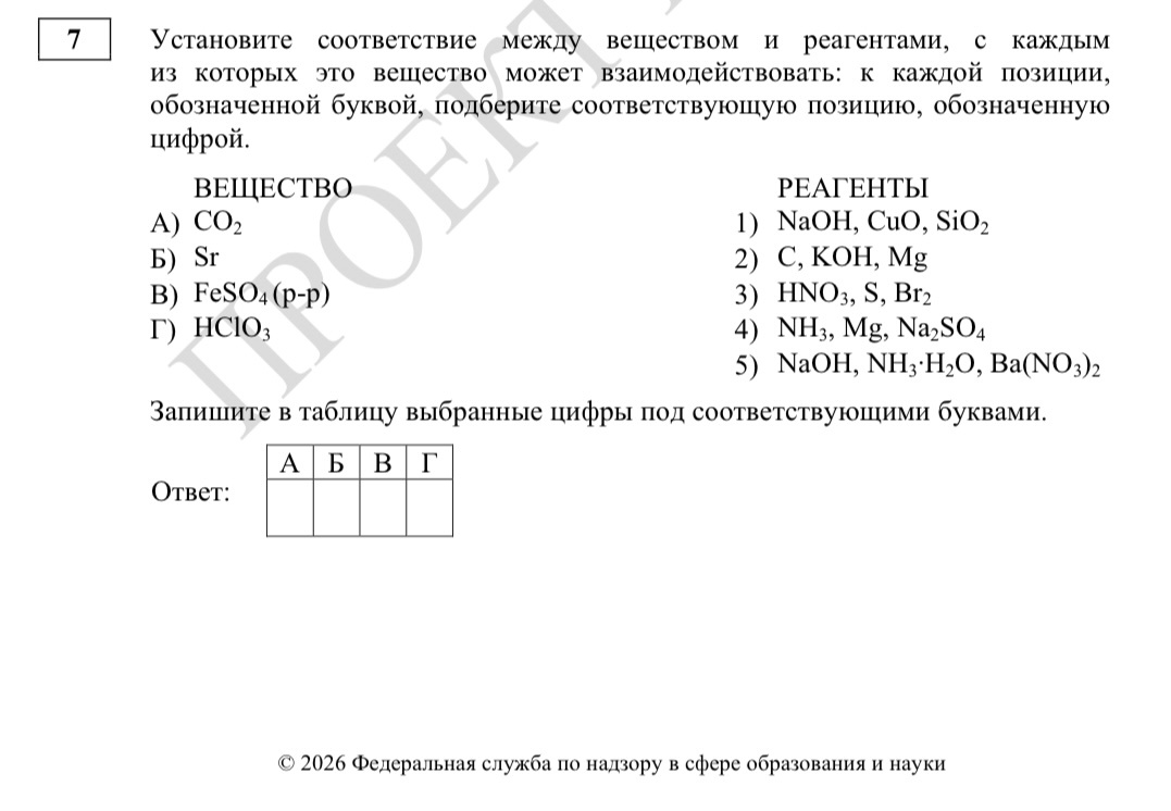 Задание 7 Установите соответствие между веществом и реагентами, с каждым из которых это вещество может взаимодействовать: к каждой позиции, обозначенной буквой, подберите соответствующую позицию, обозначенную цифрой. ВЕЩЕСТВО A) CO2 Б) Sr B) FeSO4 (p-p) Г) HСlO3 РЕАГЕНТЫ 1) NaOH, CuO, Si02 2) С, КОН, Мg 3) HNO3, S, Br2 4) NH3, Mg, Na2SO4 5) NaOH, NH3•H2O, Ba(NO3)2 Такое задание удобно решать таблицей: Теперь вспоминает общие химические свойства классов соединений и начинаем рассуждать: А) CO2 Углекислый газ- кислотный оксид, а кислотные оксиды реагируют с : В 1 варианте есть sio2- кислотный оксид, поэтому реакция не идет. Пункт 2. В случае с углекислым газом и углеродом будет образовываться угарный газ, реакция конпропорционирования ☑️, так же металлы средней активности способны гореть в угарном газе ☑️ и, конечно, по общим свойствам: кислотный оксид+ щелочь= соль + вода ☑️ Поэтому к CO2 подходит 2) вариант. Б) Sr стронций Как любой металл реагирует с : Сразу вычеркиваем вари