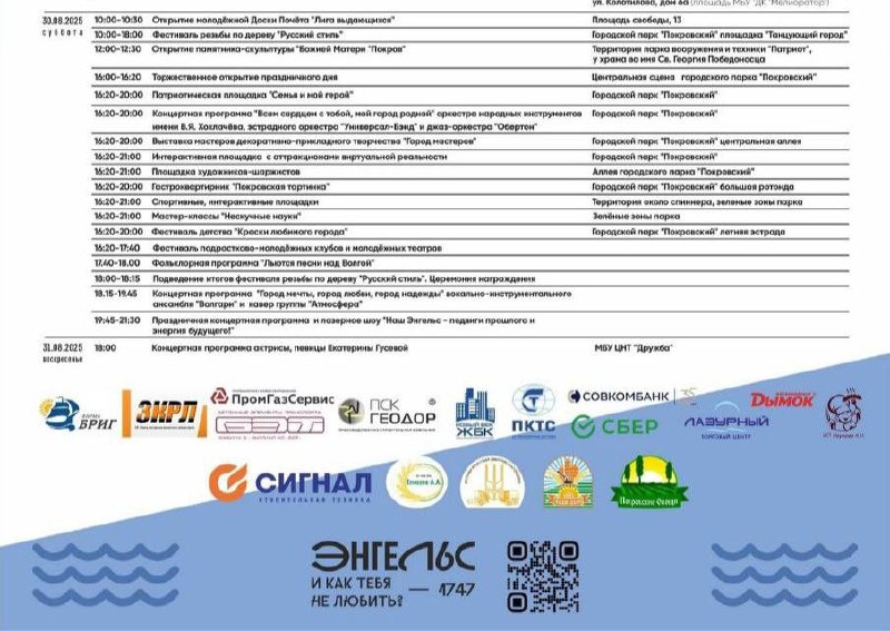 В Энгельсе завтра, 30 августа, пройдут мероприятия по случаю Дня города. Афишу подглядела у «Саратовского моста». В Саратове активно отмечать будет 13-14 сентября.