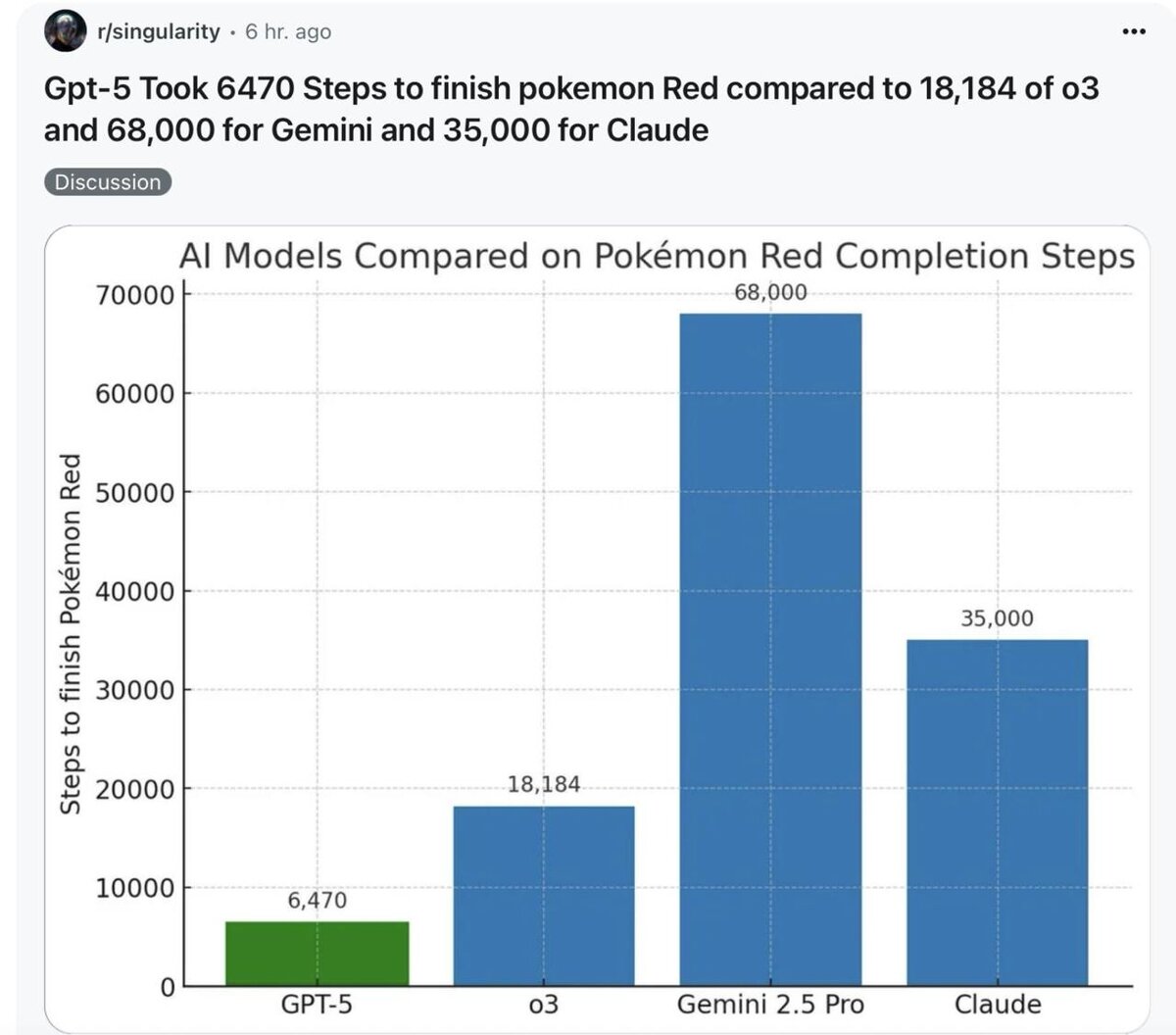 Who can speedrun Pokémon Red the fastest? 🏃♂️💨 📊 Here are the results: - GPT-5: 6,470 steps - o3: 18,184 steps - Claude: 35,000 steps - Gemini 2.5 Pro: 68,000 steps ⚡️ GPT-5 is three times faster than o3 and nearly ten times more efficient than Gemini! This comparison showcases not just "gaming skills," but also the models' abilities in planning, optimizing, and cutting out unnecessary actions. 🎮✨ #Speedrun #Pokémon