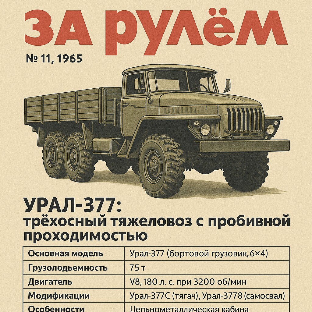 🚛 Урал‑377: советский тяжеловес без лишнего пафоса В «За рулём» № 11 за 1965 год инженер Ю.Мидзяев пишет о машине, которая могла бы тянуть целую стройку. Урал‑377 — не просто бортовой грузовик, а целое семейство надёжных тяжеловозов. 💪 Схема — 6×4, грузоподъёмность — 7,5 тонны. Без переднего моста, но с карбюраторной «восьмёркой» на 180 л.с. — тот же мотор, что и у Урал‑375. 🔧 Главное — унификация: кабина, двигатель, ходовка — всё совместимо. Это значит: проще обслуживать, быстрее производить, легче ремонтировать в поле. 🔁 Варианты: — Урал‑377С — седельный тягач под сцепку от МАЗ‑200В — Урал‑377В — самосвал под стройку 📌 Важный момент: кабина цельнометаллическая, а вот передний привод убрали. Сделали упор на дороги и перевозку тяжёлого. 🛠️ Для тех, кто уважает простоту и советскую инженерию — достойный пример эпохи. 🗂 Полный выпуск: «За рулём», № 11, 1965 👉 Какую модификацию выбрал бы ты — тягач или самосвал? Или есть любимец поинтереснее? #ИсторияСДороги #Урал377 #Тех