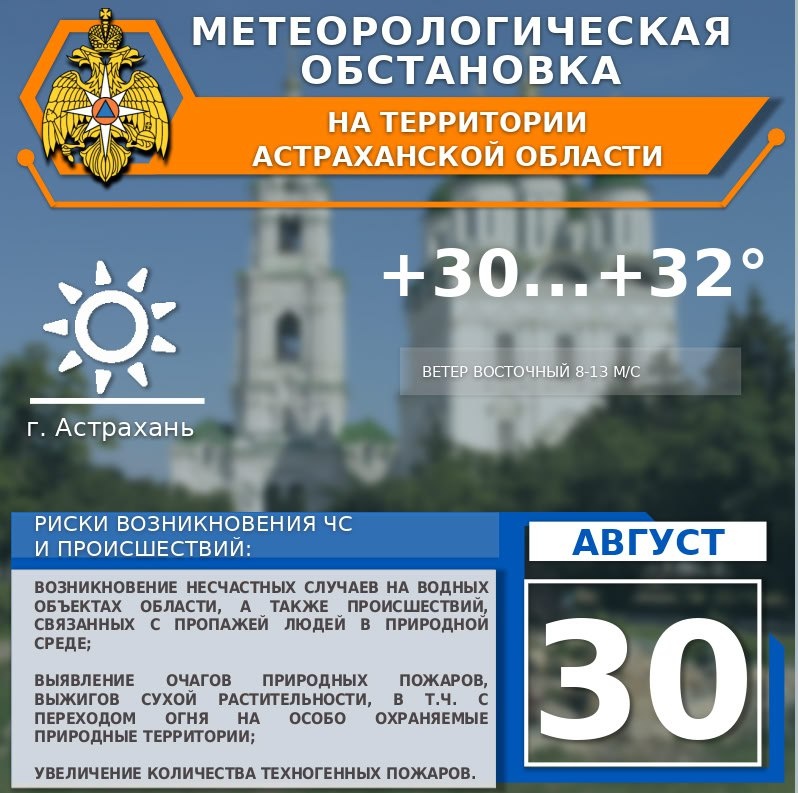 🦋Метеорологическая обстановка на 30 августа ☀️На территории области ясно. 🌬Ветер восточный 8-13 м/с, местами порывы до 16 м/с. 🌡Температура воздуха днем +29...+34°, ночью +13...+18°. ☀️По г. Астрахань ясно. 🌬Ветер восточный 8-13 м/с. 🌡Температура воздуха днем +30...+32°, ночью +16...+18°. ✅Присоединяйся к МЧС Астрахань 👉Подписывайся на МЧС России в Telegram | MAX