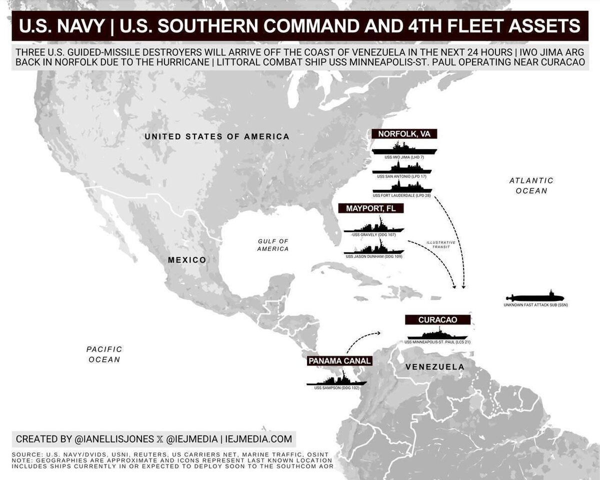 Трамп отправил семь военных кораблей, подлодку и 2200 морпехов к берегам Венесуэлы. В ответ в стране объявили мобилизацию. Формально, американские усилия направлены на борьбу с наркотрафиком, однако издание Axios пишет о возможном старте операции по свержению Николаса Мадуро, которого Трамп называет не президентом, а главой наркокартеля.