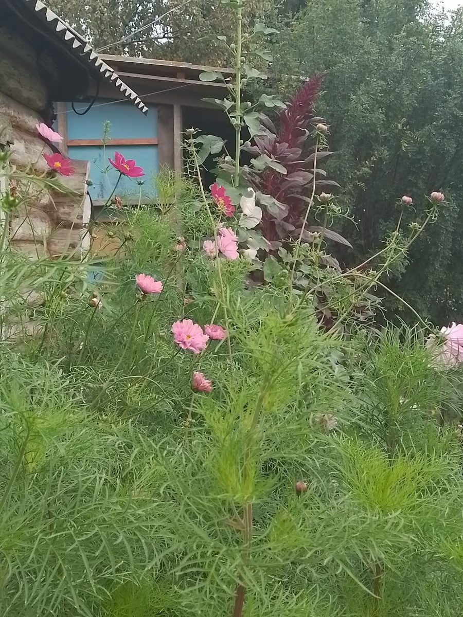 Космея, мальва и амарант. Вот таким ансамблем они у меня растут перед домом.
