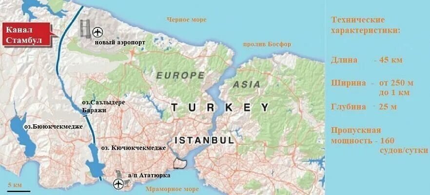 Турция планирует реализовать один из самых амбициозных инфраструктурных проектов в своей истории — строительство Стамбульского канала (Kanal İstanbul). Этот искусственный водный путь призван соединить Чёрное и Мраморное моря в обход пролива Босфор, что может кардинально изменить географию и экономику региона. Вот ключевые аспекты этого грандиозного замысла. 1. Основные характеристики проекта · Длина и глубина: Канал протянется на 45–50 км при глубине 25 метров и ширине 150–360 метров (на поверхности воды). Это позволит проходить крупнейшим танкерам и контейнеровозам . · Маршрут: Пройдет через европейскую часть Стамбула, от Чёрного моря (восточнее озера Теркос) до Мраморного моря (через озера Кючюкчекмедже и Сазлыдере) . · Сроки и стоимость: Строительство начато в 2021 году, планируемое завершение — 2027 год. Стоимость оценивается в $15–25 млрд . 2. Почему Стамбул может стать островом? После завершения канала европейская часть Стамбула окажется между: · Босфором (естественный пролив н