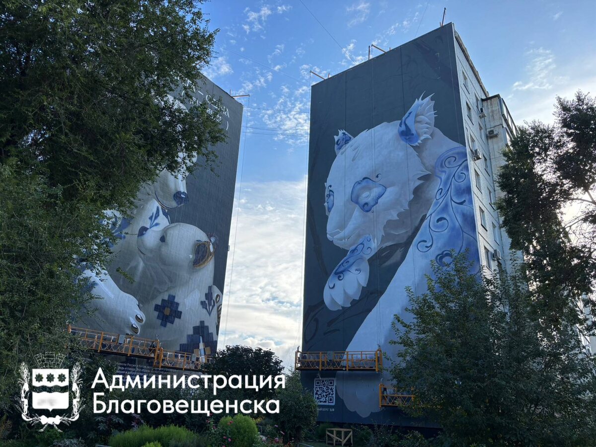 Животных решили изобразить фарфоровыми. В Благовещенске завершают реализацию культурного проекта "Два берега - одна река". На фасадах многоэтажек на Калинина, 61 и Горького, 161 почти готовы огромные изображения двух фарфоровых статуэток - медведицы с медвежонком и панды. Автором одного из муралов стал уличный художник Nut из китайской провинции Гуандун. Второе изображение создавала российская команда SPEKTR. Каждый мурал оснастят QR-кодом, ведущим на страницу с фольклорными историями о медведях и пандах. "Художественные муралы делают облик Благовещенска неповторимым и узнаваемым. В этом году мы сделали уже третий мурал, и каждый из них вносит свой вклад в создание городской среды. Так, изображения маршала Рокоссовского и "Воина-освободителя" олицетворяют силу и героизм нашего народа. А медведи и панда символизируют дружбу и сотрудничество с Китаем", - подчеркнул глава Благовещенска Олег Имамеев. В мэрии города напомнили адреса, где в этом году появились другие монументальные рисунки.