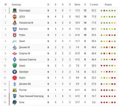 Приветствую, Вас, уважаемые читатели! В Российской Премьер-Лиги сыграно уже 6 матчей. Пройдено 20% пути. Голов в прошлом 6туре было забито 31 в 8 матчах-это рекорд для этого сезона. Для начала обратимся к турнирной таблице прежде, чем приступить к прогнозам. Центральным матчем тура, безусловно, будет игра "ЦСКА-Краснодар". Игравшие недавно в суперкубковом матче снова сойдутся в бою. Действующий обладатель Кубка России примет действующего чемпиона России. Краснодар в данный момент -лидер чемпионата России, а ЦСКА идёт на втором месте. В пользу Краснодара говорят статистические показатели, но ЦСКА будет играть дома. Я склоняюсь к тому, что матч завершится вничью. Оренбург-Рубин. Рубин в последнее время показывает нестабильную игру и не умеет играть против грандов российского футбола, но более уверенно чувствует себя в игре против середняков и аутсайдеров. У Оренбурга в последних матчах наладилась атакующая игра, но есть проблемы в защите. В целом, силы команд равны. Я считаю, что Оренбур