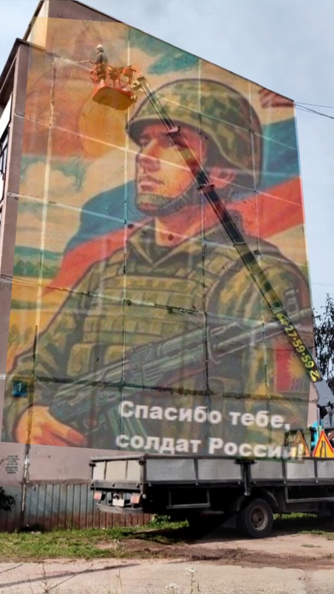 Мурал с воином России появится рядом с перекрёстком трассы Вилюй и улицы Пролетарской. На жилом доме рядом с бывшей военной частью уже приступили к работам.