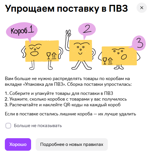 Для поставок по модели «Маркетплейс» (FBS) не нужно уточнять, в каком именно коробе лежит каждый товар. Достаточно добавить общее количество коробов, в которые вы сложили товары.