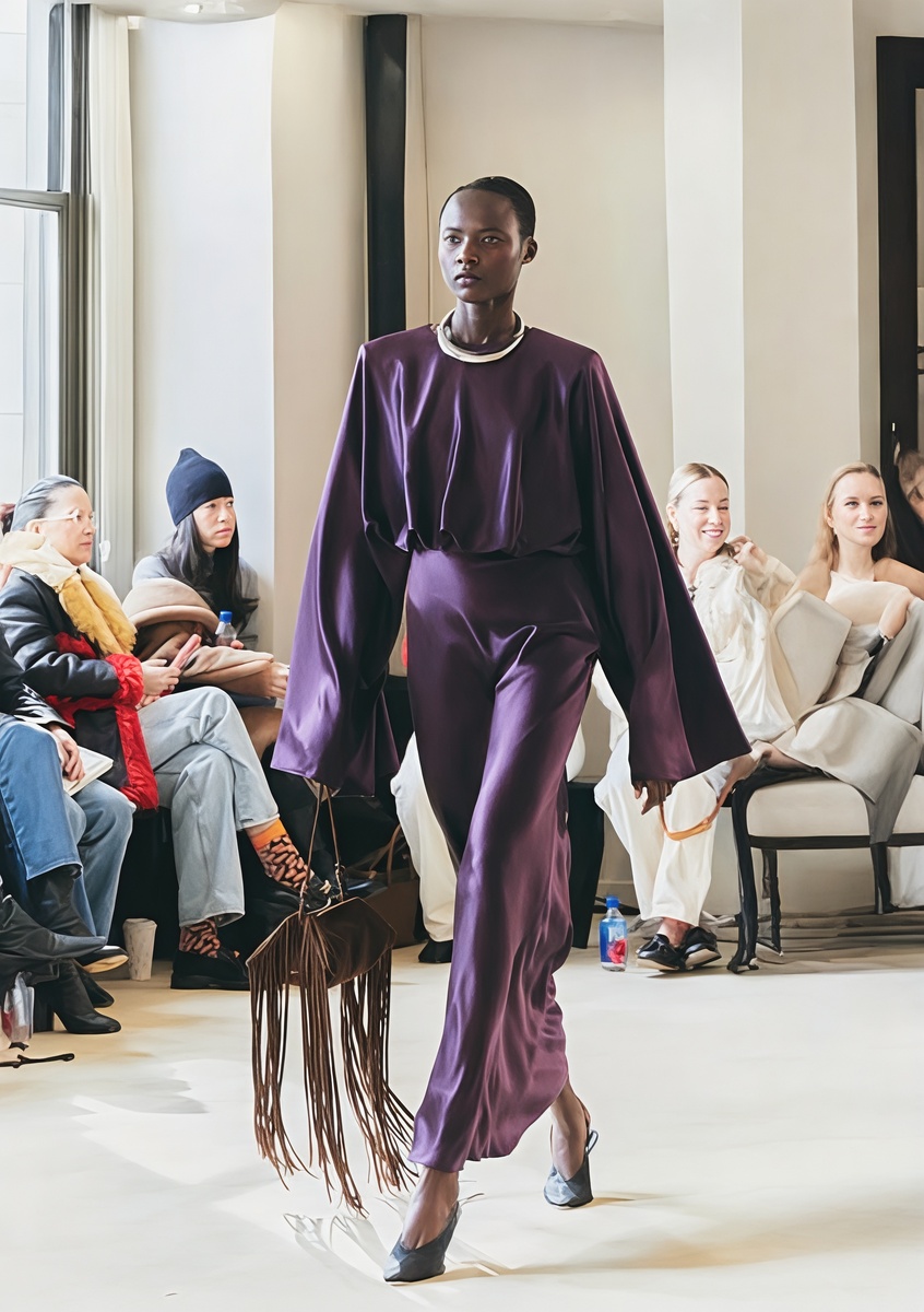 На показе Altuzarra струящиеся атласные платья цвета спелой сливы выглядели просто роскошно. Michael Kors и Carolina Herrera представили фиолетовый в лаконичных монохромных образах — и каждая модель излучала уверенность и достоинство. Дизайнеры Alaïa и Ralph Lauren сделали его главным акцентом вечерних нарядов, доказав: фиолетовый способен затмить даже самый изысканный чёрный.