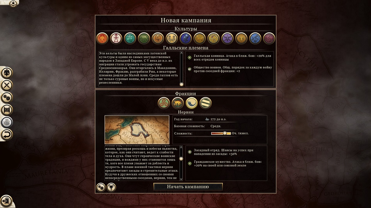 Они оказали одно из самых ожесточённых сопротивлений римскому завоеванию. После сражений с ними Цезарь напишет в «Записках о Галльской войне»: «Нервии — отважнейшие из всех белгов». Он описывает их как народ с спартанской культурой: Их общество было воинственным и аскетичным, а вся жизнь строилась вокруг подготовки к бою. Согласно археологическим данным и свидетельствам Цезаря, основным оружием нервиев, как и у большинства галльских племён, были: Особенно примечательно, что Цезарь сообщает, что у нервиев не было кавалерии. На самом деле они возводили изгороди из колючих кустарников и деревьев по всей своей территории, чтобы затруднить передвижение вражеской кавалерии. Фракция Нервии представлена как варварское племя, живущее в лес