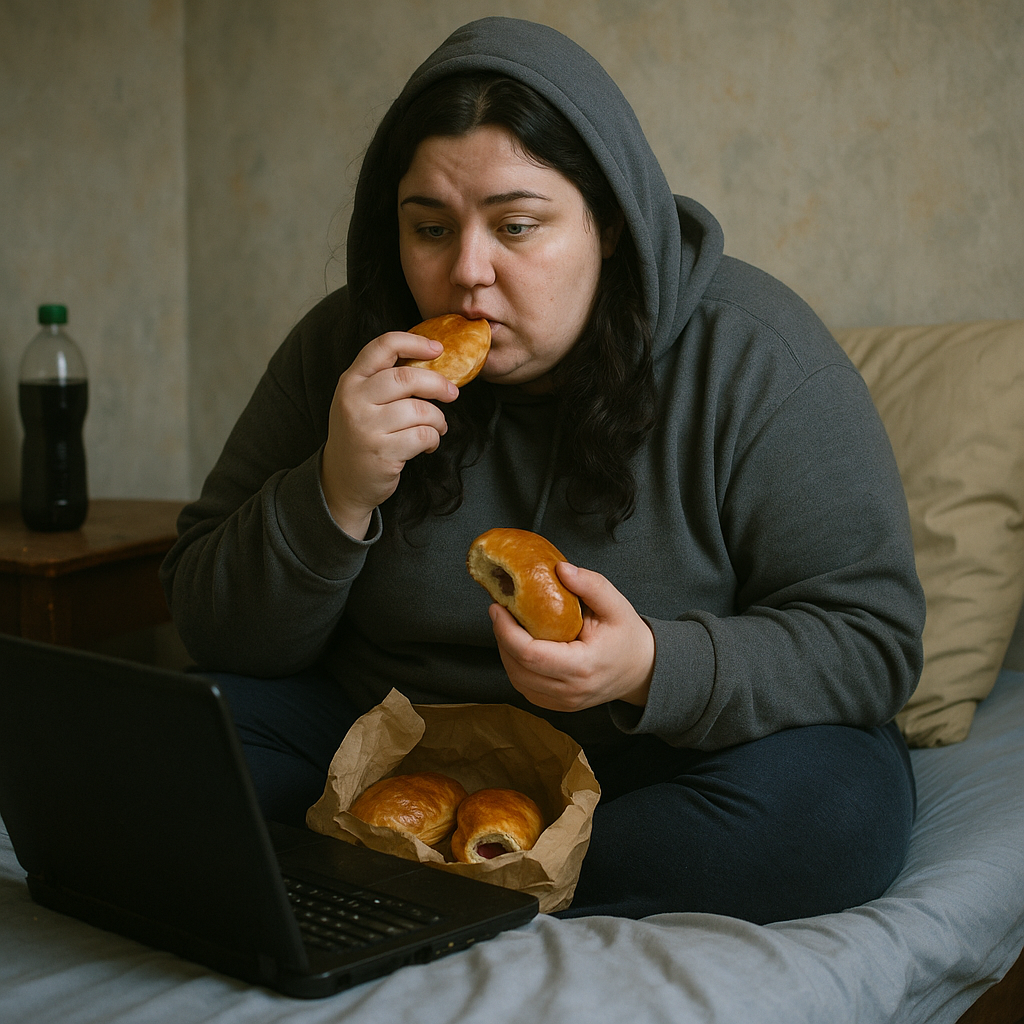 Вика не ответила. Даже не повернулась. Когда стало совсем тихо, она встала. Натянула спортивные штаны, куртку, надела капюшон и вышла. Снег уже подтаял, везде были серые лужи и слякоть. Она брела, не разбирая дороги, пока не оказалась у магазина. “Семья” — знакомые жёлтые буквы. Она зашла и пошла вдоль полок. Взяла первое, что захотелось: сосиски в тесте, два сладких пирожка, шоколадку, газировку. Потом вернулась и кинула всё это на свою кровать. Включила ноутбук, поставила сериал. И начала есть. Пирожки были мягкие, сладкие. Сначала один, потом второй. Потом сосиска. Потом шоколад. Она не чувствовала вкуса. Только тепло внутри. Только тупую тяжесть, которая будто заполняла дыру, оставленную вчерашним