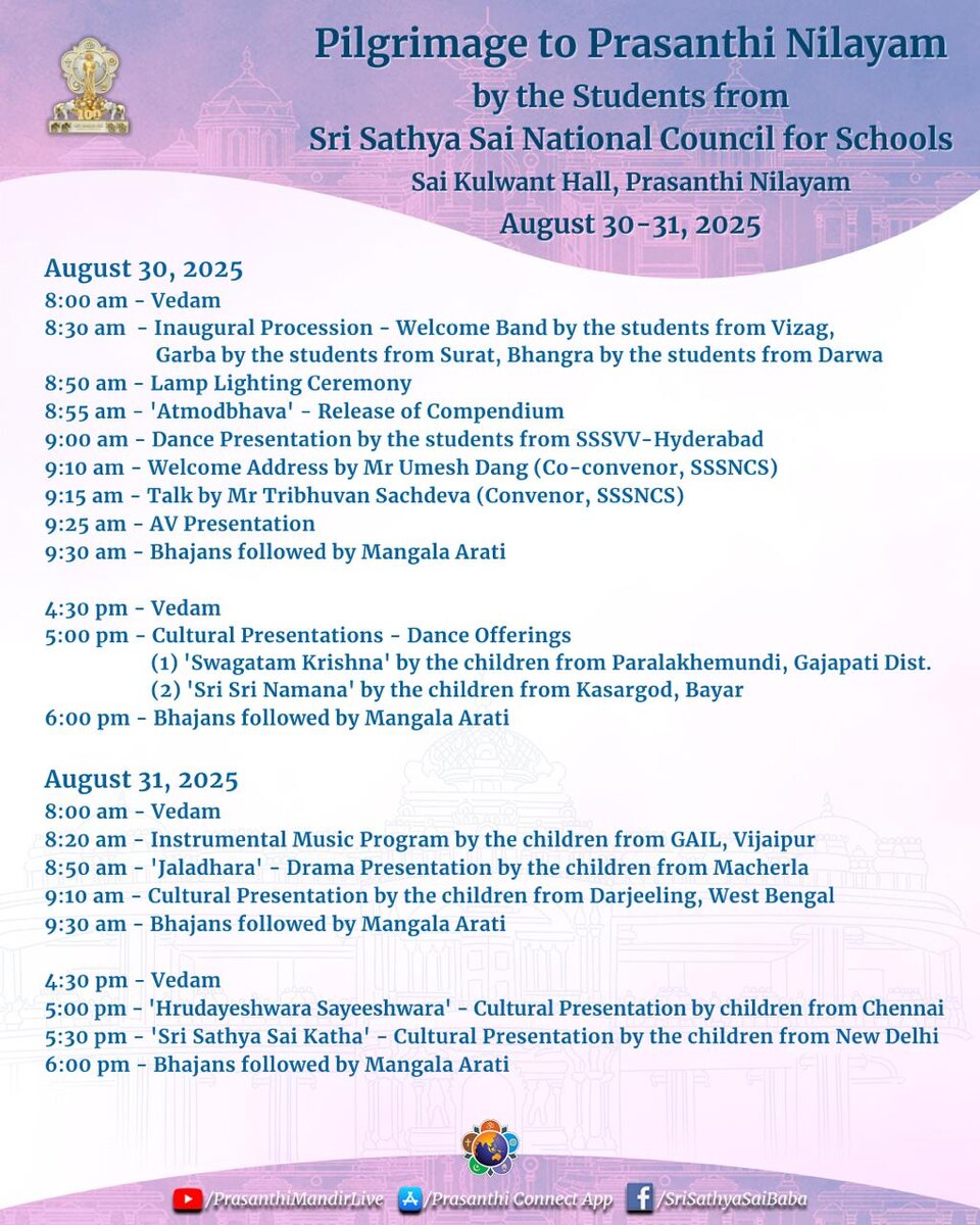 Паломничество в Прашанти Нилаям учащихся Национального совета по школам Шри Сатья Саи. Саи Кульвант Холл, Прашанти Нилаям 30 августа 2025 8:00* - Веды 8:30 - Торжественное шествие: приветственный оркестр учащихся из Визага, Гарба – учащихся из Сурата, Бхангра – учащихся из Дарвы 8:50 - Церемония зажжения факела 8:55 - Атмодбхава – выпуск сборника 9:00 - Танцевальное представление учащихся из ШССВВ-Хайдарабад 9:10 - Приветственное слово г-на Умеша Данга (соруководителя НСШШСС) 9:15 - Выступление г-на Трибхувана Сачдева (руководитель НСШШСС) 9:25 - Аудиовизуальная-презентация 9:30 - Бхаджаны и Мангала Арати 🪷 16:30 - Веды 17:00 - Культурные программы – Танцевальные представления (1) «Свагатам Кришна» детей из Паралакхемунди, округ Гаджапати. (2) «Шри Шри Намана» в исполнении детей из Касаргода, Баяр 18:00 - Бхаджаны и Мангала Арати 31 августа 2025 г. 8:00 - Веды 8:20 - Инструментальная музыкальная программа в исполнении детей из ГАИЛ, Виджайпур 8:50 - "Джаладх