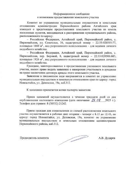 Название: Земельный участок, расположенный по адресу: Алтайский край, Первомайский район, с. Первомайское, пер. Боровой, 8, площадь земельного участка - 1926 кв.м., вид разрешенного использования - для ведения личного подсобного хозяйства, кадастровый номер: 22:33:020506:685 Канал: Госземля Алтайский край Область: край Алтайский Район: м.р-н Первомайский Населенный пункт: с.п. Первомайский сельсовет, с Первомайское, пер Боровой, дом 8 Локация: Смотреть на карте ВРИ: Для ведения личного подсобного хозяйства (приусадебный земельный участок) Кадастровый номер: 22:33:020506:685 Кадастровая стоимость: 331002.36 Вид сделки: Аренда Площадь: 1926 м² Начальная цена: - руб. Дата завершения: 28.09.2025 Подробнее: ГИС ТОРГИ #госземля #земляотгосударства #земля #земельныйучасток #земельныеторги #торги #аукцион #арендаземли #аренда #алтайскийкрай