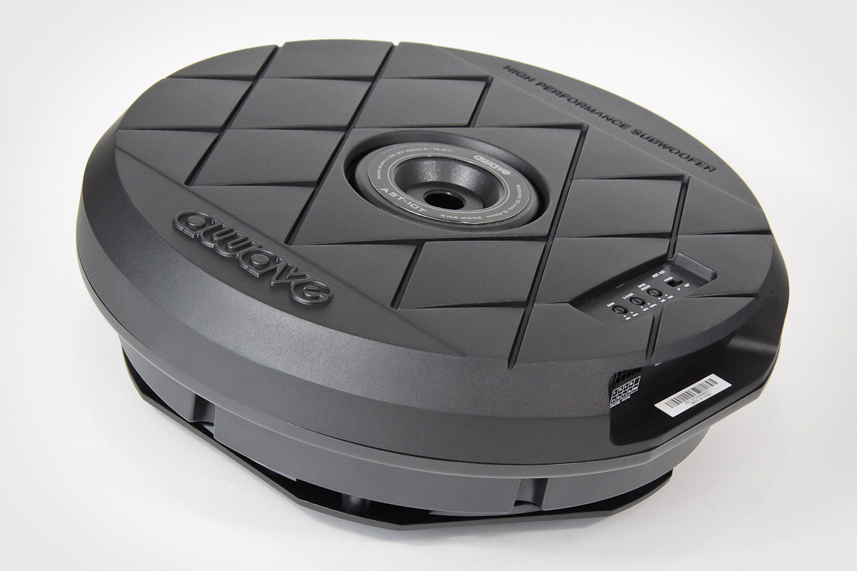В случае же с Awave AST-10T решили не делать перед диффузором жёсткую конструкцию, динамик практически открыт, а акустической нагрузкой является само запасное колесо и, собственно, ниша, в котором оно расположено. Это сохраняет сам принцип акустической нагрузки диффузора, но эффективность излучения получается немного выше.