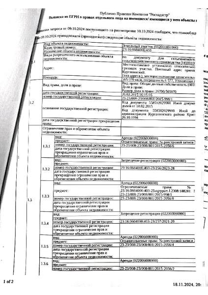 Название: Д-к: Фельде С.Б. 26700/565070 доли в праве долевой собственности на земельный участок (земли сельскохозяйственного назначения), площадь 565070 +/– 6577 кв.м., кадастровый номер 23:16:0604000:403. Почтовый адрес ориентира: Краснодарский край, Курганинский район. Начальная цена 1 266 755 руб., задаток 190 014 руб., шаг аукциона 12 668 руб., ув.655 Канал: Госземля Краснодарский край Область: - Район: - Населенный пункт: - Локация: Смотреть на карте ВРИ: Сельскохозяйственное использование Кадастровый номер: 23:16:0604000:403 Кадастровая стоимость: 8442145.80 Вид сделки: Продажа Площадь: 565070 м² Начальная цена: 1266755.00 руб. Дата завершения: 29.09.2025 Подробнее: ГИС ТОРГИ #госземля #земляотгосударства #земля #земельныйучасток #земельныеторги #торги #аукцион #продажаземли #продажа #краснодарскийкрай
