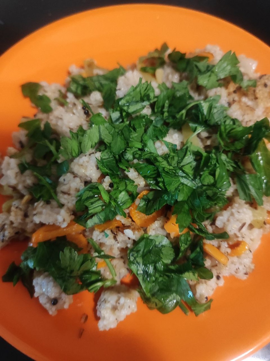 Простой рецепт для завтрака или ужина или все новое - хорошо забытое старое:) Решила попробовать варить крупу в пароварке (стояла без дела в шкафу лет 15:)). В этом случае не надо постоянно следить при приготовлении, не пригорит, вода не выкипит:)) Главное, добавить достаточно воды в контейнер - на 1-1,5 см выше уровня крупы - у меня ячка. Затем: - растопить в сковороде 1-2 стол ложки топленого масла - прогреть специи до появления потрескивания (у меня кумин и семена горчицы) - положить овощи (у меня лук, морковь и перец болгарский) - когда овощи почти готовы, добавить крупу в сковороду - готовое блюдо украсить зеленью (петрушкой или кинзой) Чем полезно: - специи и зелень для здоровья печени, - топленое масло и специи для улучшения переваривания - овощи для здоровья кишечника Для тех, кому надо снизить вес, можно есть ячневую крупу 3-4 раза в неделю. Лучше поменьше лука, побольше перца, стеблей сельдерея и тд Для тех, кому надо набрать вес, есть не чаще 1-2 раз в неделю. Можно по