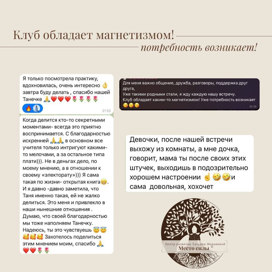 🕊Всё получилось намного лучше, чем я предполагала! Ещё совсем недавно это была всего лишь идея — создать свой закрытый женский клуб. А уже более полугода, как мы живём в этом пространстве. 🌷 Пространстве поддержки, заботы и ежедневной трансформации. 🌷 Пространстве, где можно быть собой, делиться, открываться и получать понимание. 🌷 Пространстве, где мы вместе делаем шаги к переменам, практикуем, общаемся, вдохновляем друг друга. За это время мы прошли десятки практик, сотни живых диалогов и тысячи искренних эмоций. И самое ценное — каждая участница чувствует: она не одна, рядом есть поле женщин, которое поддерживает и бережёт. 🚩 Отзывы, которые вы пишете, для меня — знак, что клуб действительно стал местом силы. И я благодарна каждой за то, что мы вместе создаём это уникальное пространство. ✨ И хорошая новость — ты тоже можешь стать частью клуба! Присоединяйся и окунись в атмосферу женской энергии, вдохновения и внутренней опоры. 📌 Хочешь к нам в клуб? Чтобы вступить — пиш