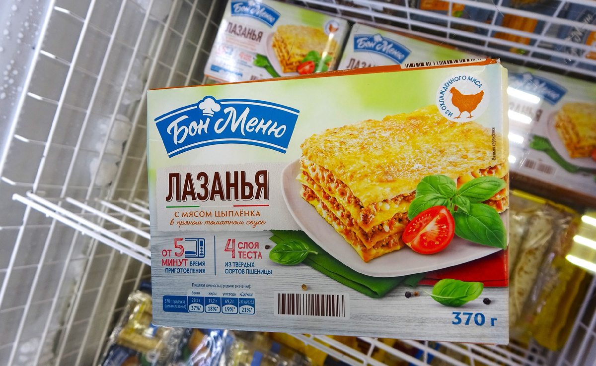 Выбираю себе тесто замороженное в Чижике, а рядом при мне покупательница достает коробку Лазанью Бонменю из охлажденного мяса цыпленка в пряном томатном соусе. В коробке 370г. Цена 139 руб. Изготовитель ООО Продукты питания Комбинат, г. Калининград.