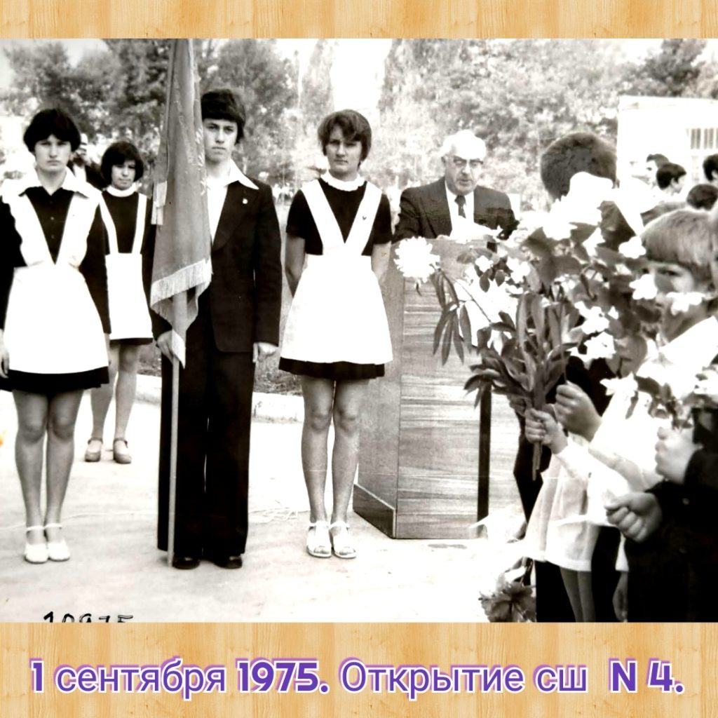 На представленной фотографии запечатлен этот исторический момент. 1 сентября 1975 года после получения символического ключа от нового здания, переданного строителями, выступает директор школы Начар А.П. Он объявляет об открытии школы и предоставляет право Первому секретарю горкома партии И. С. Ищенко перерезать ленточку входа в учебный корпус. В почетном карауле я и ассистенты знаменосца.