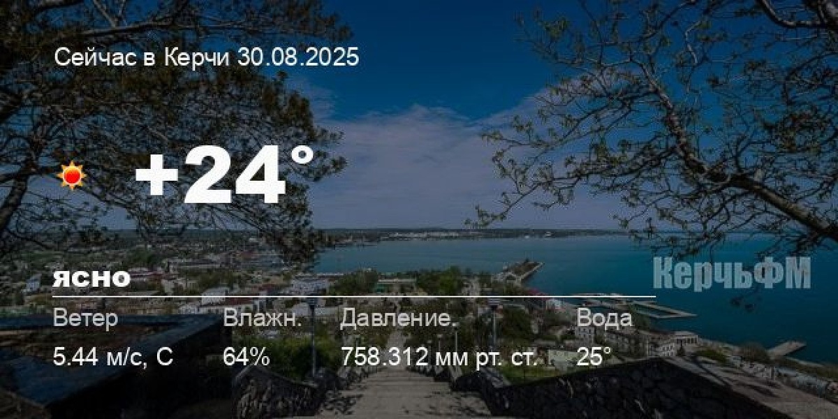 Погода в Керчи 30 августа Сегодня днем в Керчи, 30 августа, ожидается ясная погода, температура воздуха от +23.2° до +26°С, ветер северный 3.82 м/с, порывы до 10.29 м/с, давление 757.6 мм рт. ст., влажность 67%. Ближайшей ночью ожидается ясная погода, температура +22.6°С. Завтра, 31 августа, в течение суток ожидается ясная погода; ночью +22.6°С, днем +24.5°С, ветер северный 4.06 м/с. - Феодосия от +21° до +27.1°С, 🌞 ясно, море: 24°C - Судак от +18.7° до +25.5°С, 🌞 ясно, море: 24°C - Симферополь от +18... подробнее Подписывайся на КерчьФМ.РФ @kerchfm