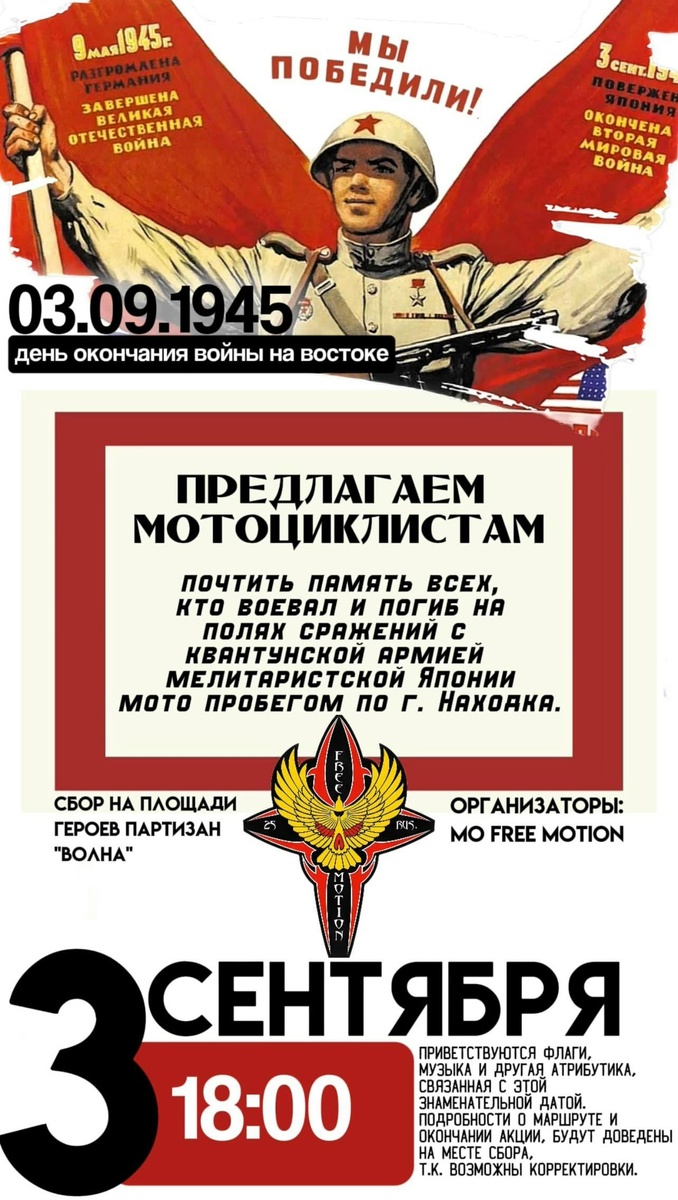 🔁 Дальняк.рф™: Дорогие друзья! 9 мая мы отметили 80тую готовщину Победы над Германией. Но не нужно забывать о том, что этой датой война не закончилась. На Дальнем востоке была решающая битва за искоренение фашизма. Победу над Японией одержали дальневосточные подразделения Красной Армии. Дата 3 сентября - День окончания войны на востоке🇷? Предлагаем мотоциклистам почтить память всех, кто воевал и погиб на полях сражений с квантунской армией мелитаристской Японии мотопробегом по г. Находка!!! 03 сентября 25г. в 18:00ч. Объявляем сбор всех, кто желает участвовать, на 📌площади Красных партизан, остановка "Волна" г. Находка 42.842459, 132.915464 С 18:00 до 18:40 пройдёт небольшой концерт учеников Музыкальной Мастерской Сергея Акуленко с песнями о победе. https://vk.com/mmsa_nhk Приветствуются флаги, музыка и другая атрибутика, связанная с этой знаменательной датой. Подробности о маршруте и окончании акции, будут доведены на месте сбора, т. к. возможны корректировки.