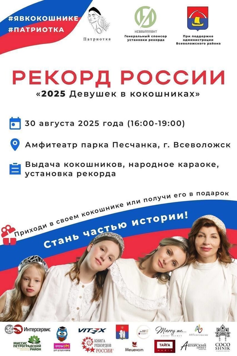 Сегодня, 30 августа, в общественном пространстве «Парк Песчанка» пройдет большая праздничная программа «Всеволожский район – земля героев». На главной сцене парка 13:00 – театрализованная программа «Всеволожский район – земля героев». 15:00 – интерактивная программа для детей. 19:00 – на сцене приглашенные артисты и творческие коллективы Всеволожского района. В амфитеатре парка 11:00 – бизнес-пикник предпринимателей. 16:00 – народное караоке под руководством Дмитрия Лаутало и Ксении Васильевской. 18:00 – рекорд России «2025 женщин в кокошниках». Желающие принять участие женщины могут подойти заранее со своим кокошником или получить от организаторов. Завершится день праздничным салютом в 22:00. Тем временем в Гатчине проходит фестиваль световых инсталляций.