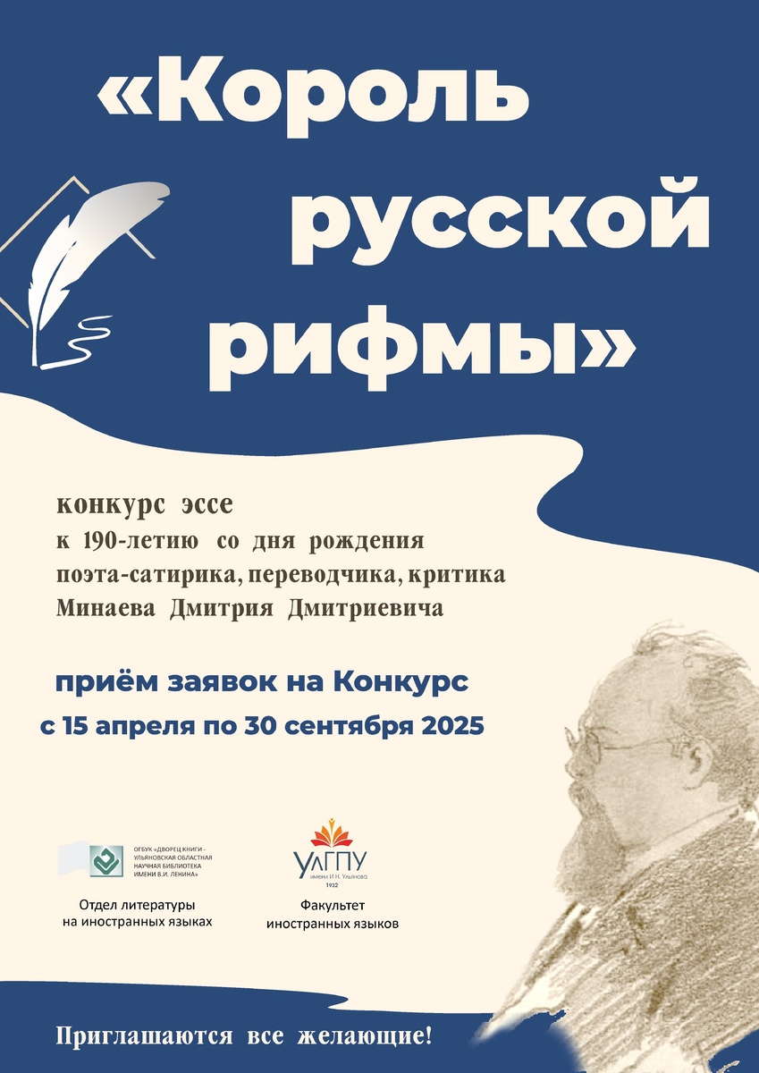 Если вы хотели, но не успевали принять участие в конкурсе эссе «Король русской рифмы», эта новость для ВАС! ❗Прием заявок на конкурс эссе о жизни и творчестве Минаева ПРОДЛЕН до 30 сентября 2025 года! 💥 «Король русской рифмы»: конкурс эссе на иностранных языках к 190-летию со дня рождения поэта-сатирика, переводчика, критика Минаева Дмитрия Дмитриевича. 📰 Работа высылается по электронному адресу inlit@uonb.ru (отдел литературы на иностранных языках ОГБУК «Дворец книги»). ✏️ Положение о конкурсе и подробности: http://clck.ru/3LbqXH 💫 Ждем ваших заявок!