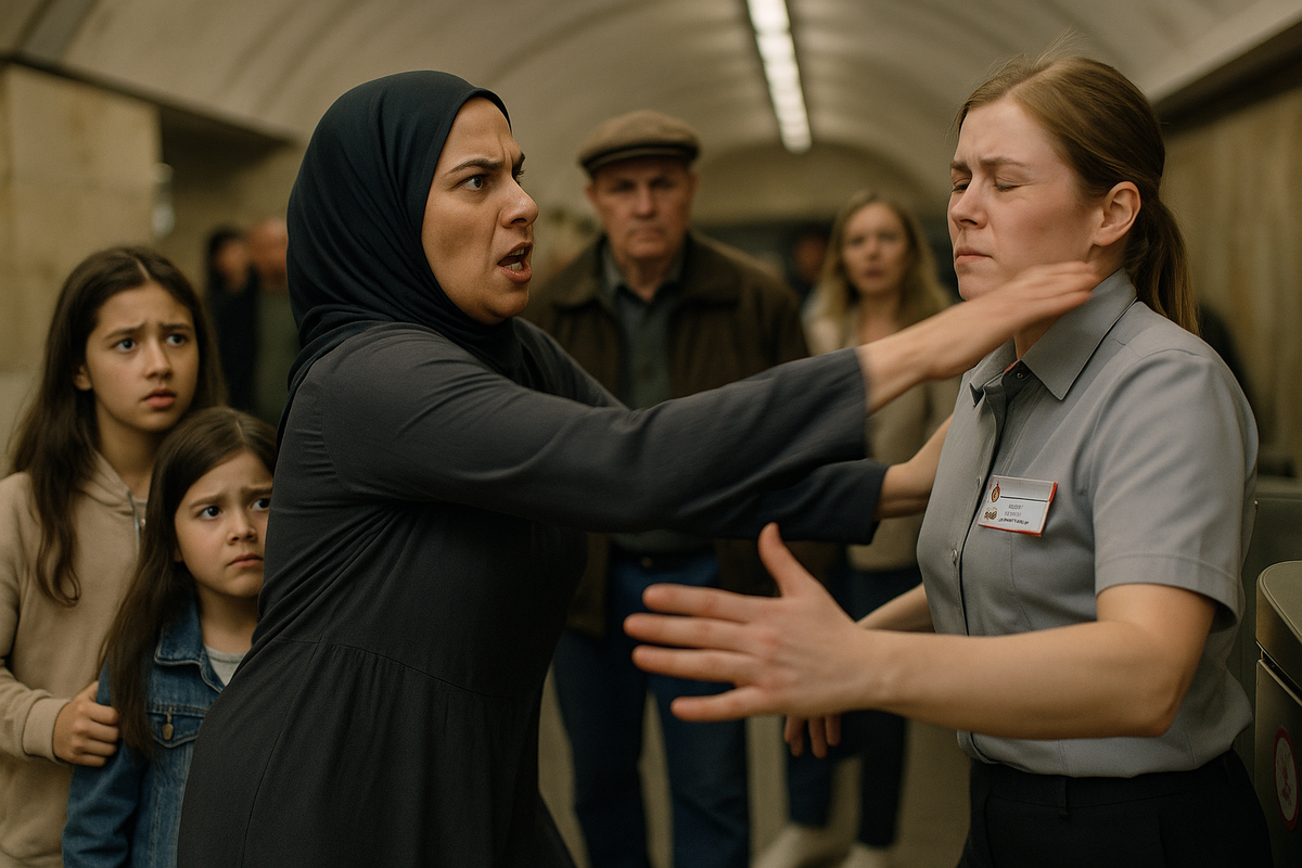 На днях в московской подземке произошёл вопиющий инцидент, который из обычного спора у турникета перерос в драку, а закончился заведением уголовного дела. Женщина в традиционном для мусульман головном уборе попыталась провести своих детей без оплаты, а когда услышала замечание от сотрудника метро, сперва обложила её трехэтажным матом, а затем перешла в рукопашную.