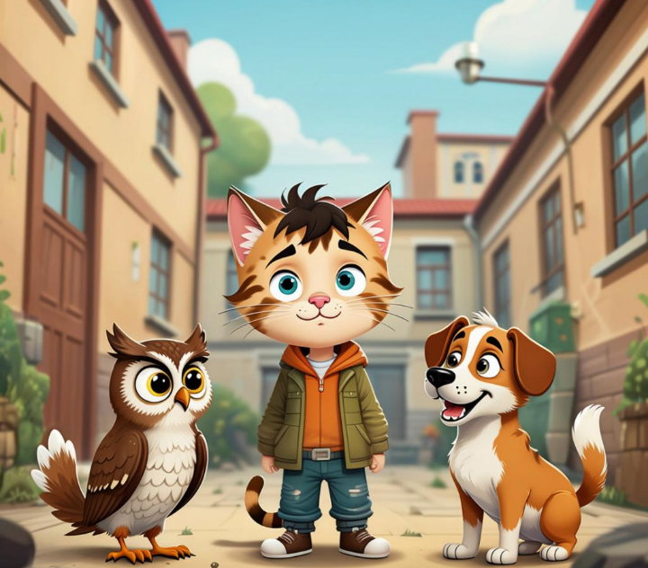 Собрался своеобразный квартет — кот-двоечник, старый пес, мудрая сова и нескладная мечтательница.
