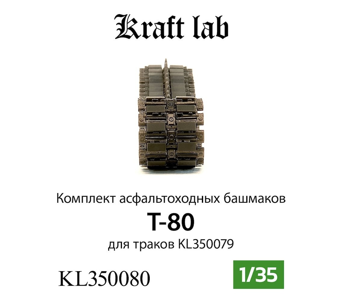 Kraft Lab из Калининграда выпустила на 3D-принтере набор асфальтоходных башмаков для гусениц из наборных траков собственного производства (KL350079 ранний тип) к моделям танков Т-80 в масштабе 1/35.