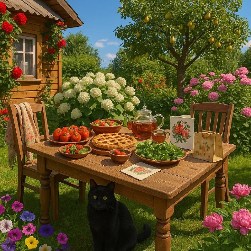 Июль в ЗемлеТочечном наступил с лёгким потрескиванием — то ли от цикад, 🦗 то ли от вечного радиоприёмника 🌟 Олега Петровича. Воздух стал плотнее, будто настоялся на травах 🌿 и солнечных лучах. ☀️ Груши ☀️☀️☀️ в саду налились так, что напоминали жёлтые фонари, подвешенные прямо к веткам. Некоторые — особенно самоуверенные — отваливались с глухим стуком и катились под кусты, как дары щедрого Юпитера, 🪐 уставшего держать план. Вишня лоснилась, 🍒 малина звала ладонями, 🤩 а огурцы 🤩 перестали прятаться под листьями, словно поняли, что всё равно их найдут и засолят. Над клумбами стоял тягучий аромат: базилик, мята, укроп, розы, 🌹 🌹🌹 липа — всё сразу. А когда ветер налетал с огорода Веры Павловны, становилось ясно: даже если цивилизация рухнет, в ЗемлеТочечном будет чем закусить. На этом фоне началась одна из самых очаровательных местных историй — подготовка ко дню рождения хранительницы дачного очага. Каждый ломал голову, что подарить человеку, 🎁 🎁 у которого цветут не