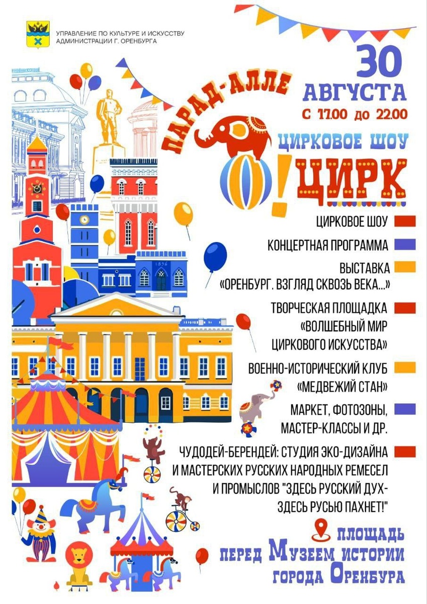 Оренбуржцев приглашают на цирковое шоу «Парад-алле». Представление состоится сегодня, 30 августа, на площади перед Музеем истории Оренбурга (Набережная, 29). Начало в 17:00. Выступят акробаты, жонглеры, эквилибристы, юные гимнасты, мастера перевоплощений и клоун Хуба Буба со своим пушистым питомцем. Также на площади будут работать творческие площадки, выставка старинных автомобилей, ландшафтный парк «Чудодей Берендей», военно-исторический клуб «Медвежий стан», маркет. Подробнее - в афише.